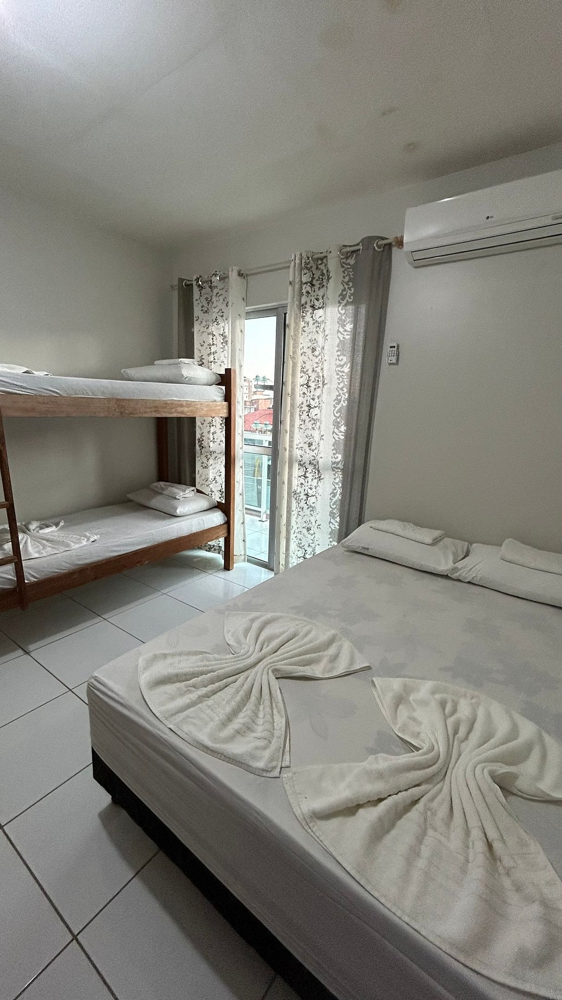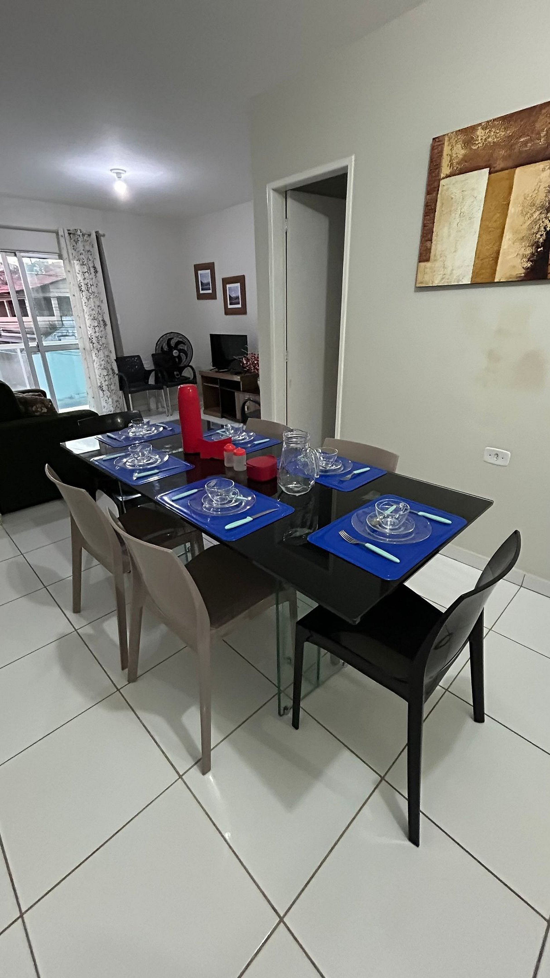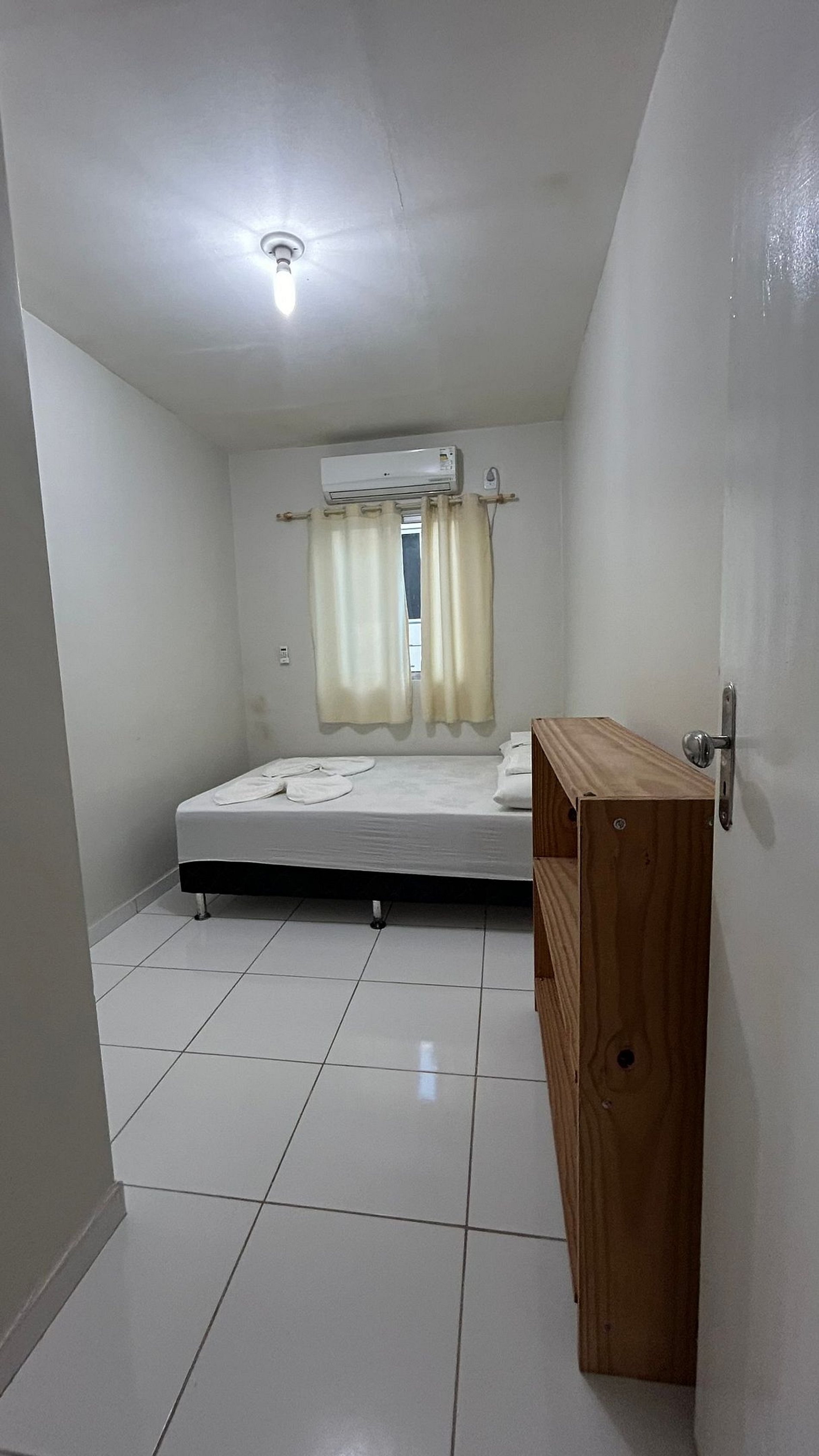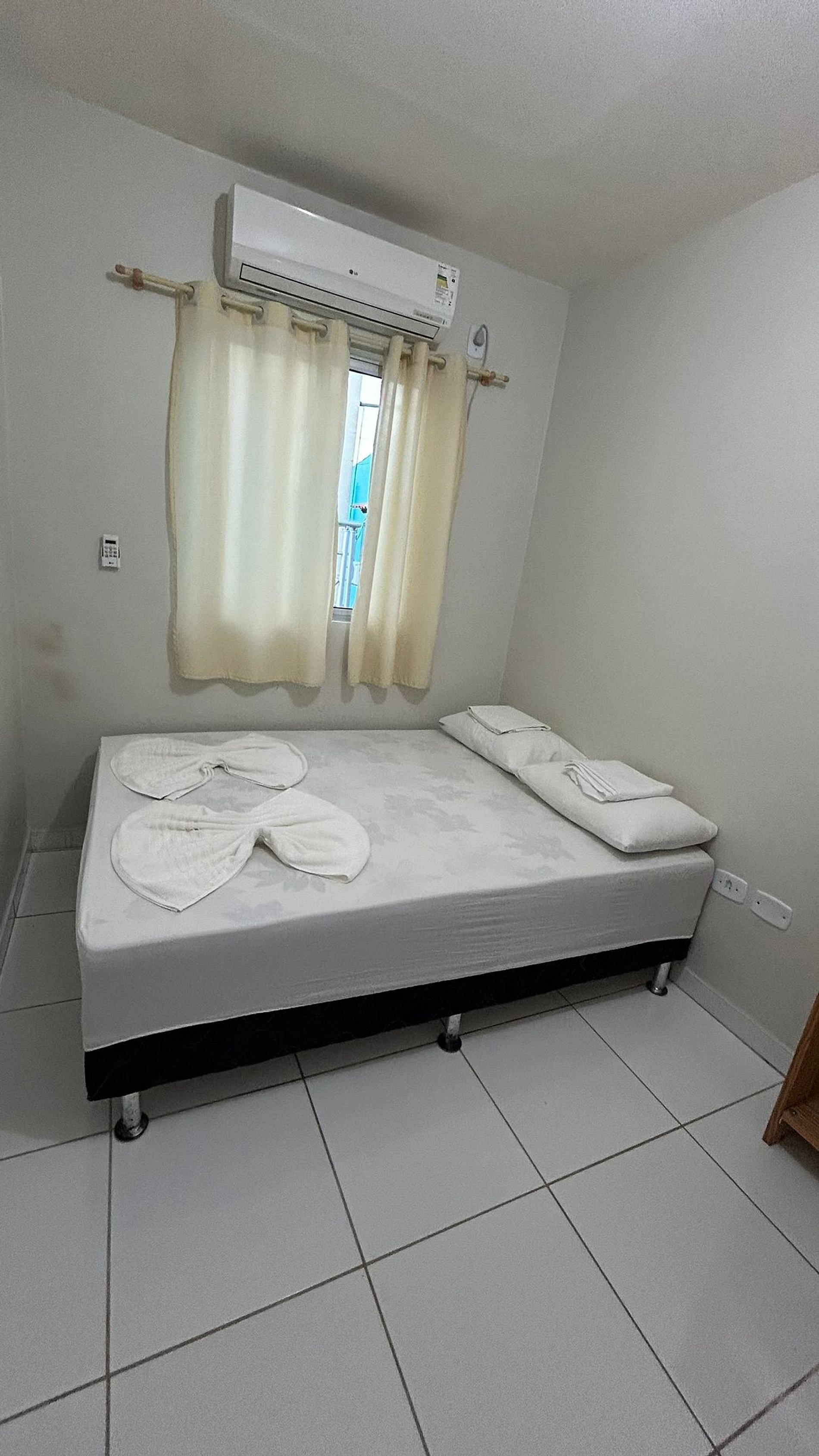 O Flat possui três quartos com ar-condicionado, sendo uma suíte com camas novas e super confortáveis uma de casal e outra de solteirão e guarda roupa casal, os outros quartos possuem camas de casal e outra cama de solteiro cada, ainda colocamos a disposição de nossos hóspedes 3 colchões para reforço, possui também um banheiro social e um lavabo, sala de jantar, sala de estar, cozinha completa com todos equipamentos e utensílios e varandas na sala e suíte.
